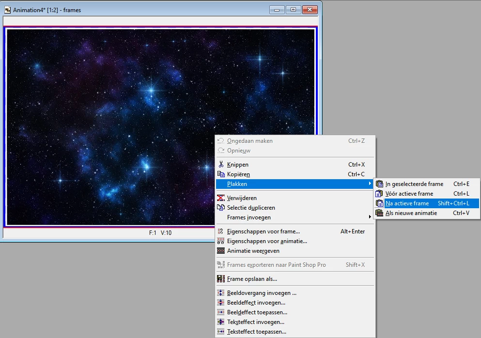 - Terug naar As > Klik in de achtergrond > Rechter muisknop > Plakken > Na actieve frame