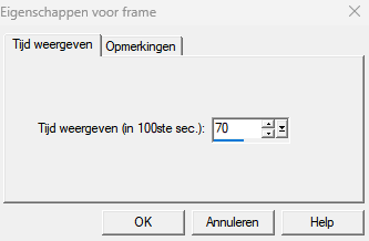 - Dubbelklik nu in het laatste frame. Dan is alleen dat frame geselecteerd > Rechter muisknop > Eigenschappen voor frame > Zet Tijd weergeven op 500