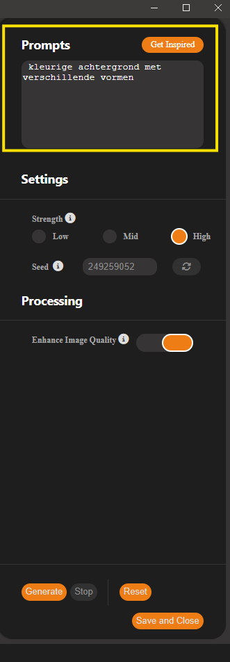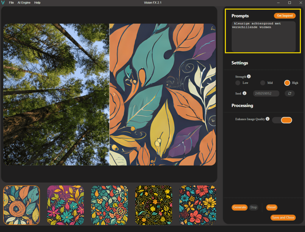 Het genereren van een afbeelding kost veel computerkracht en kost daarom tijd. Soms wel 5 minuten. Even snel een afbeelding bewerken of maken is er dus niet bij. - Zorg dat je zo min mogelijk andere programma’s open hebt als je met Vision FX werkt.