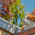 De prompt is een rood-witte kat op een muur met een blauwe lucht en bomen op de achtergrond. Het resultaat is dan dit. Dat is voor mij niet goed genoeg, dus voeg ik een nieuwe prompt toe aan het resultaat.