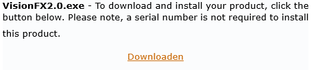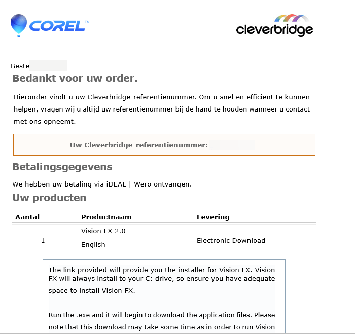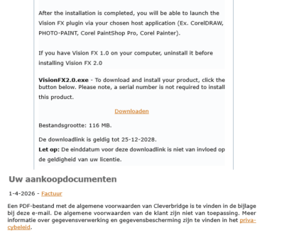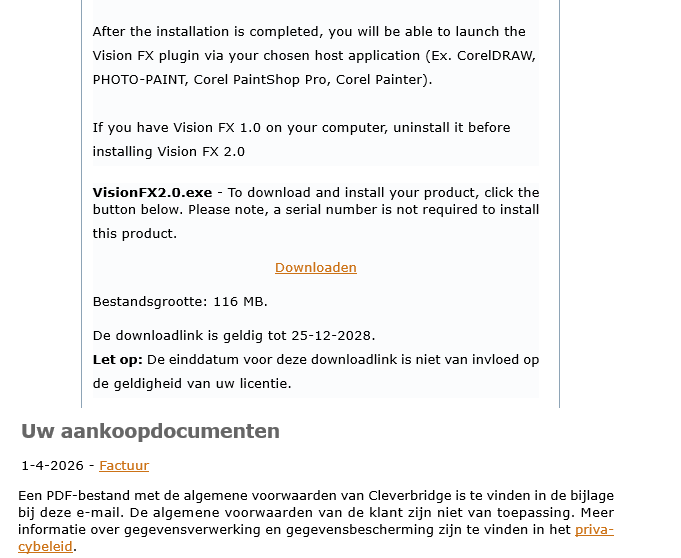 Zoals je in het rechter voorbeeld hierboven kunt zien, staat er een downloadlink in de bevestigingsmail van Corel. Of je nu via de Corel website koopt of vanuit jouw PSP, je krijgt diezelfde mail. Er hoort geen serienummer bij Vision Fx. Dat wordt automatisch aangemaakt als je het installeert.