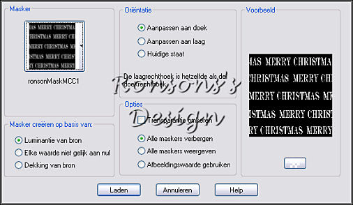 - Lagen, masker laden/opslaan, masker laden vanaf schijf, zoek het masker ronsonMaskMCC2 met dezelfde instellingen als hierboven, maar nu met Transparantie omkeren aangevinkt!!